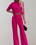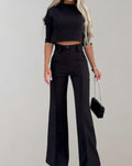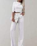Ontdek de perfecte zomerlook met deze stijlvolle 2-delige set, bestaande uit een elegante korte mouwen top en een trendy wijde broek. Deze set combineert moeiteloos comfort en mode, waardoor je er stralend uitziet bij elke zomerse gelegenheid.