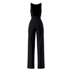 Deze zwarte maxi-jumpsuit is gemaakt van ponte stof en bestaat uit 65% rayon, 30% nylon, en 5% spandex voor een comfortabele pasvorm. Het ontwerp omvat een getailleerde top, wijde pijpen, en een open rugdetail. De jumpsuit biedt een moderne en elegante uitstraling, geschikt voor diverse gelegenheden.