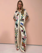 Til jouw look naar een hoger niveau met de Oriental Fusion Set! Deze tweedelige set is gemaakt van zijdezacht satijn en versierd met een kleurrijke, oosterse bloemenprint die direct de aandacht trekt. Het luchtige, relaxte ontwerp in combinatie met de glanzende stof zorgt voor een moeiteloos chique uitstraling. Of je nu thuis ontspant, een dagje uit plant of op vakantie gaat – deze set biedt de perfecte balans tussen comfort en stijl. Het losse overhemd met korte mouwen en de bijpassende wijde broek creëren samen een elegante en nonchalante look. Dankzij de soepele stof voelt de set heerlijk aan op de huid en straalt het luxe uit, zonder in te leveren op comfort.